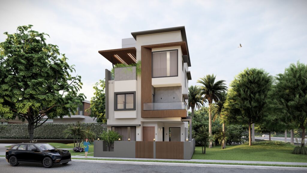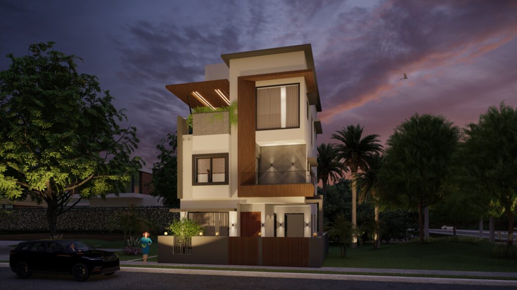 Accents: To enhance the structure’s verticality, fluted WPC (Wood Plastic Composite) panels are strategically integrated. These panels not only add texture but also create an illusion of added height, emphasizing the villa’s architectural features.