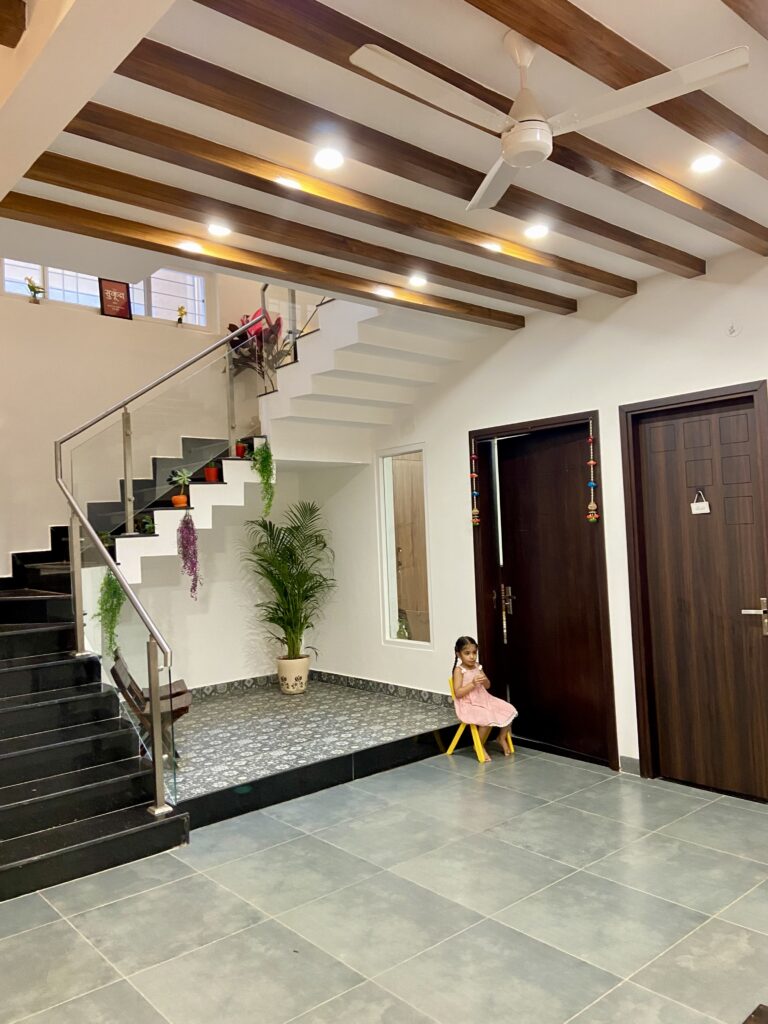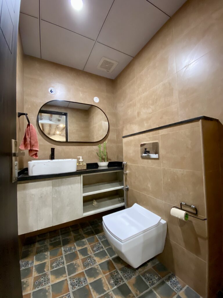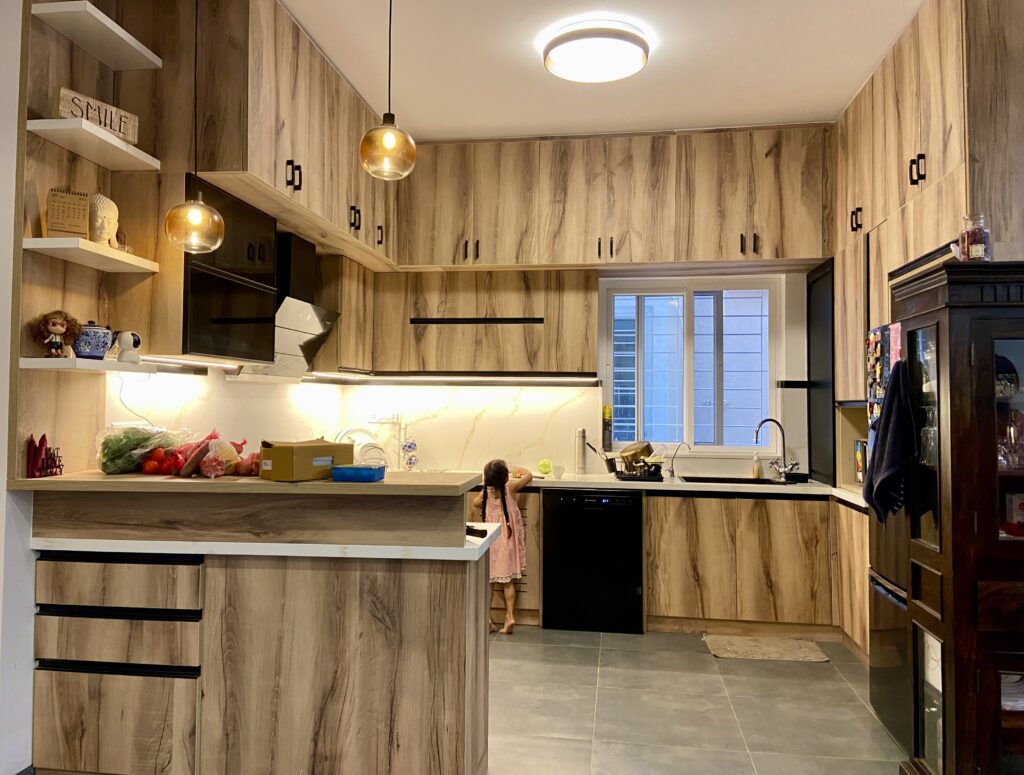 In the bedrooms, each daughter’s unique taste was thoughtfully reflected. One room embraced simplicity, with a splash of color from an abstract wallpaper, complemented by off-whites and greys for a balanced look. The other bedroom was styled in pastel pinks with wood accents, achieving a soft, warm aesthetic.