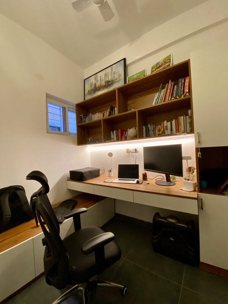 The kitchen was contemporary, featuring a sleek, extended breakfast nook positioned to face the TV for a cozy cooking and dining experience. The home office exuded strength and professionalism, perfect for focused work.