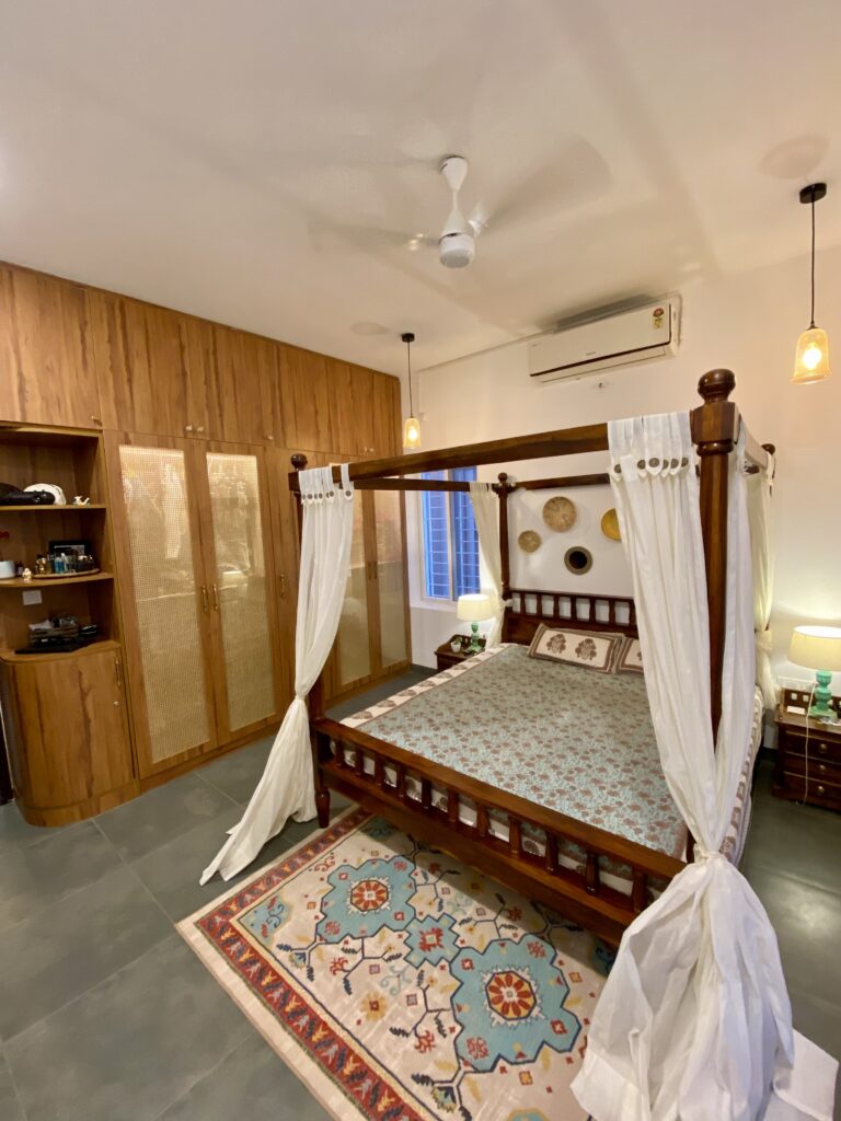 The master bedroom took on a more traditional approach, with rich brown tones that provided a comforting, familiar atmosphere. Each room, filled with personal mementos from travels, created a beautifully unique and meaningful space for this family of explorers.”