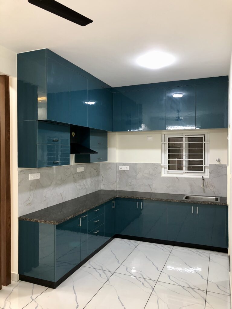 The kitchen given its compact size was designed to accommodate all essentials with a punch of green in lacquered glass. The rest was maintained in simple grey in acrylic finish, with quartz for the counter top in grey again to complement the shades around.