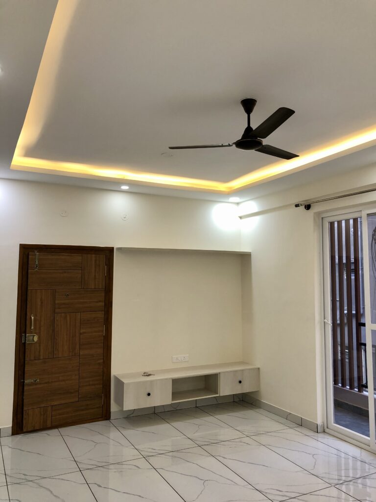 The Living / Dining with a minimalist Tv unit, a glass top dining table and a simple L-Sofa were proposed to bring in elements which are not heavy on the eye.