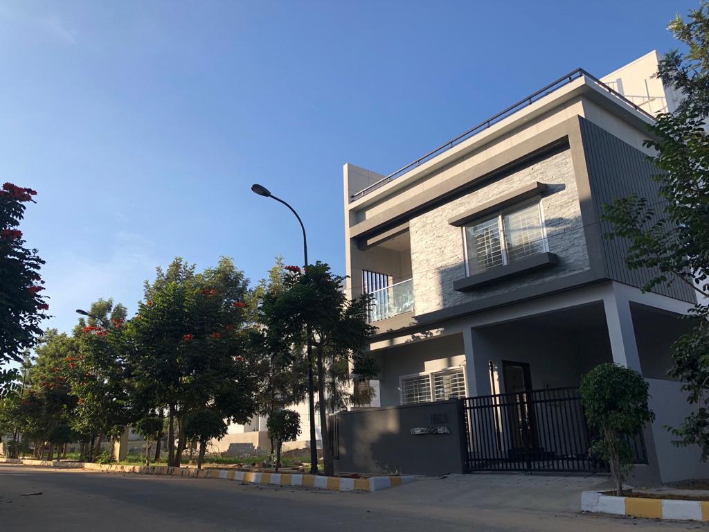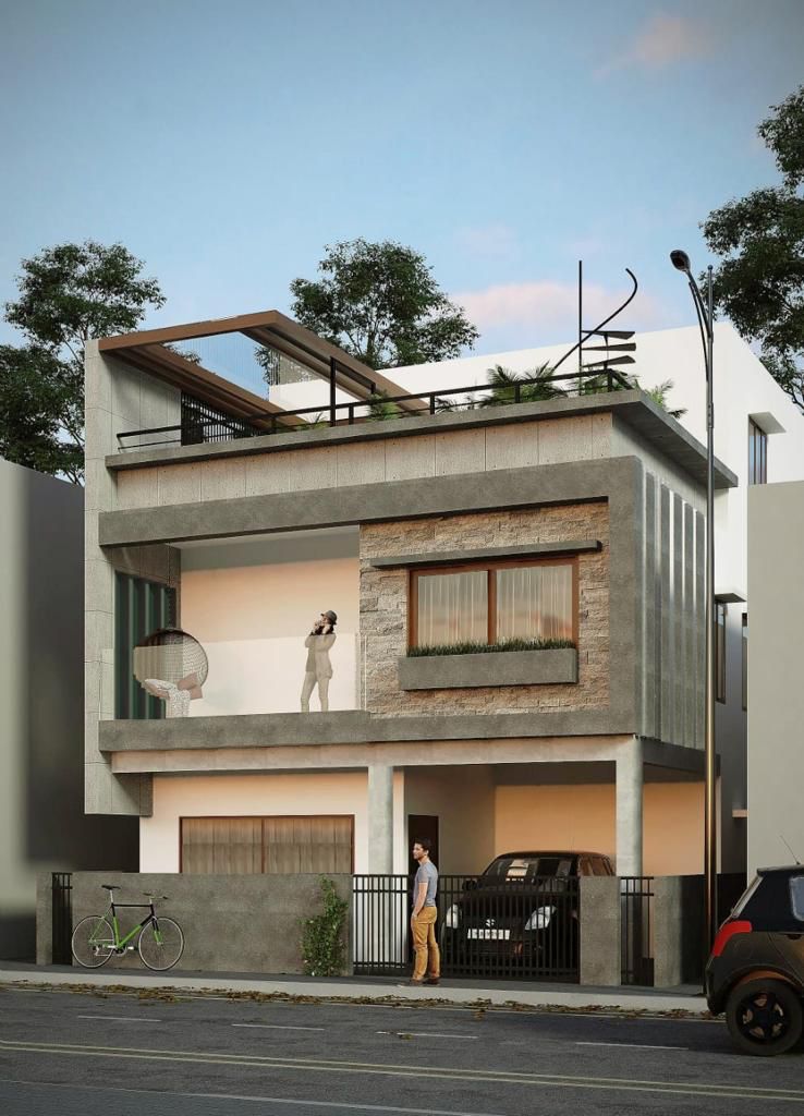 A 5bhk villa with a simple and elegant contemporary facade. With an industrial palette.