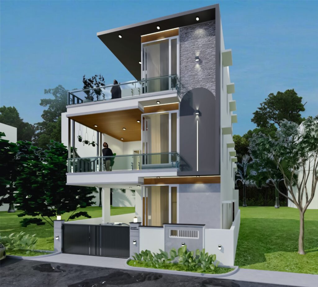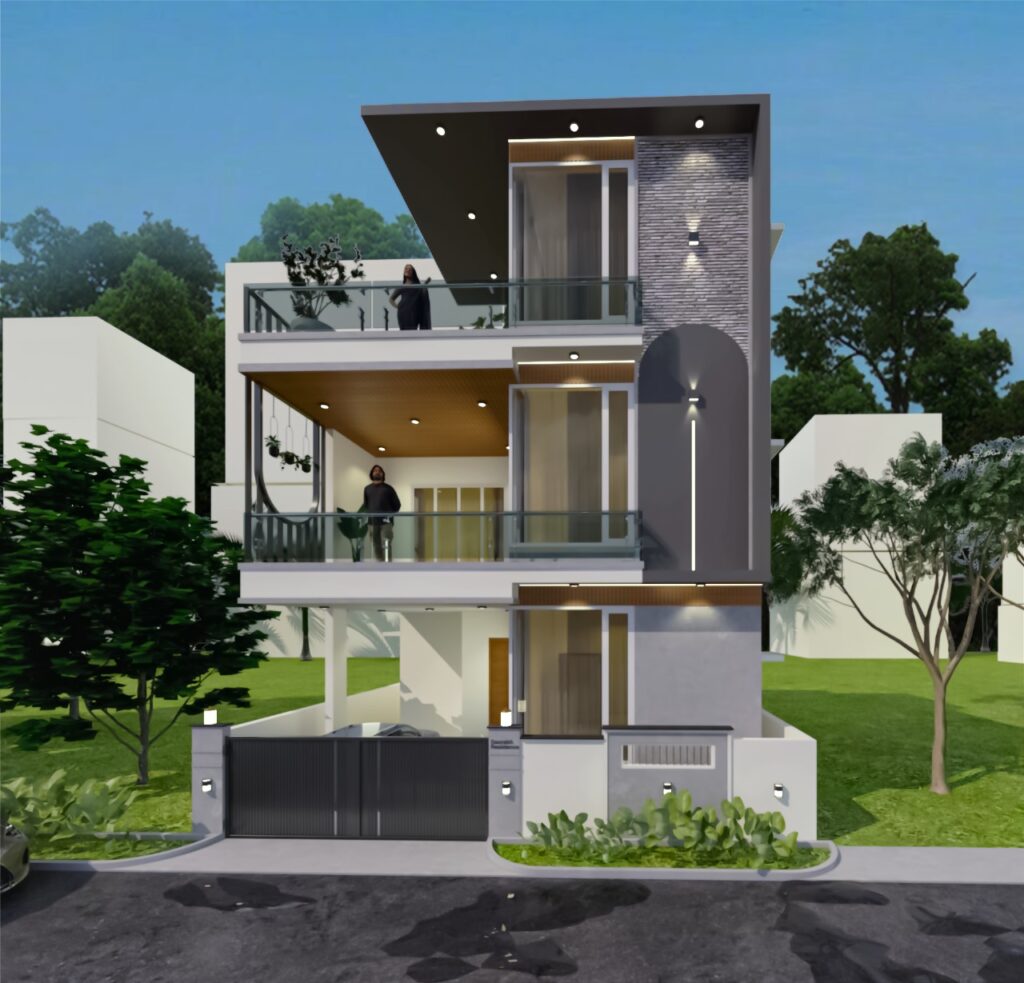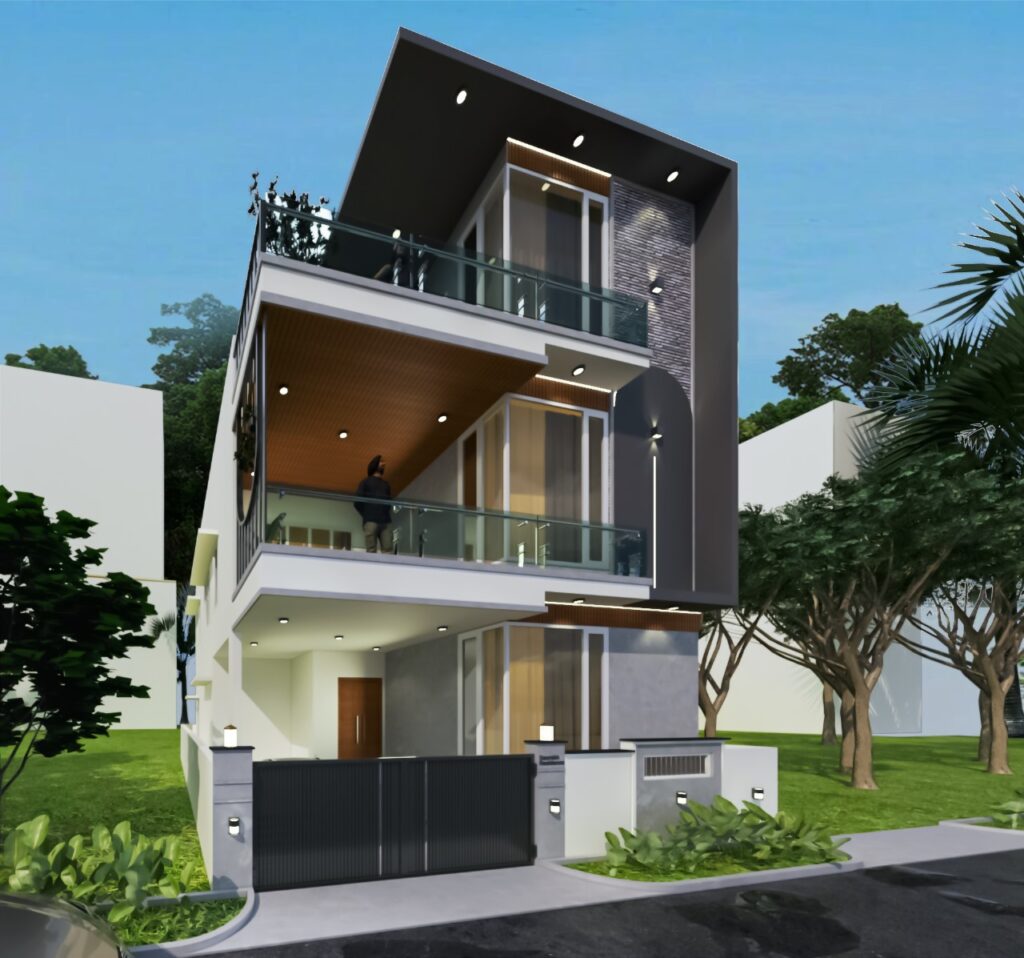 A duplex designed for our Client Mr. Saurabh with a single car parking space to ensure a larger living room with dining and kitchen on the ground floor.