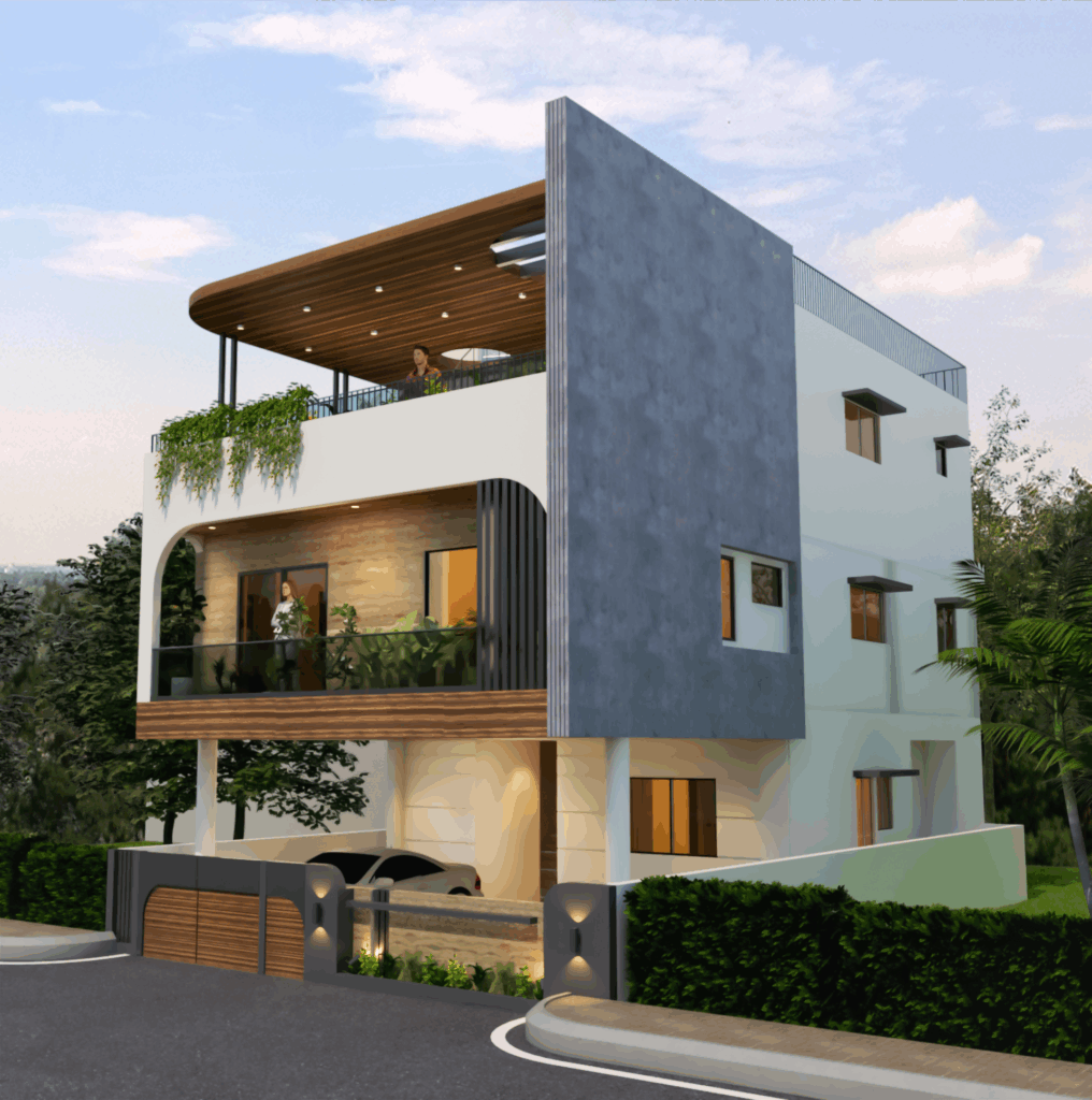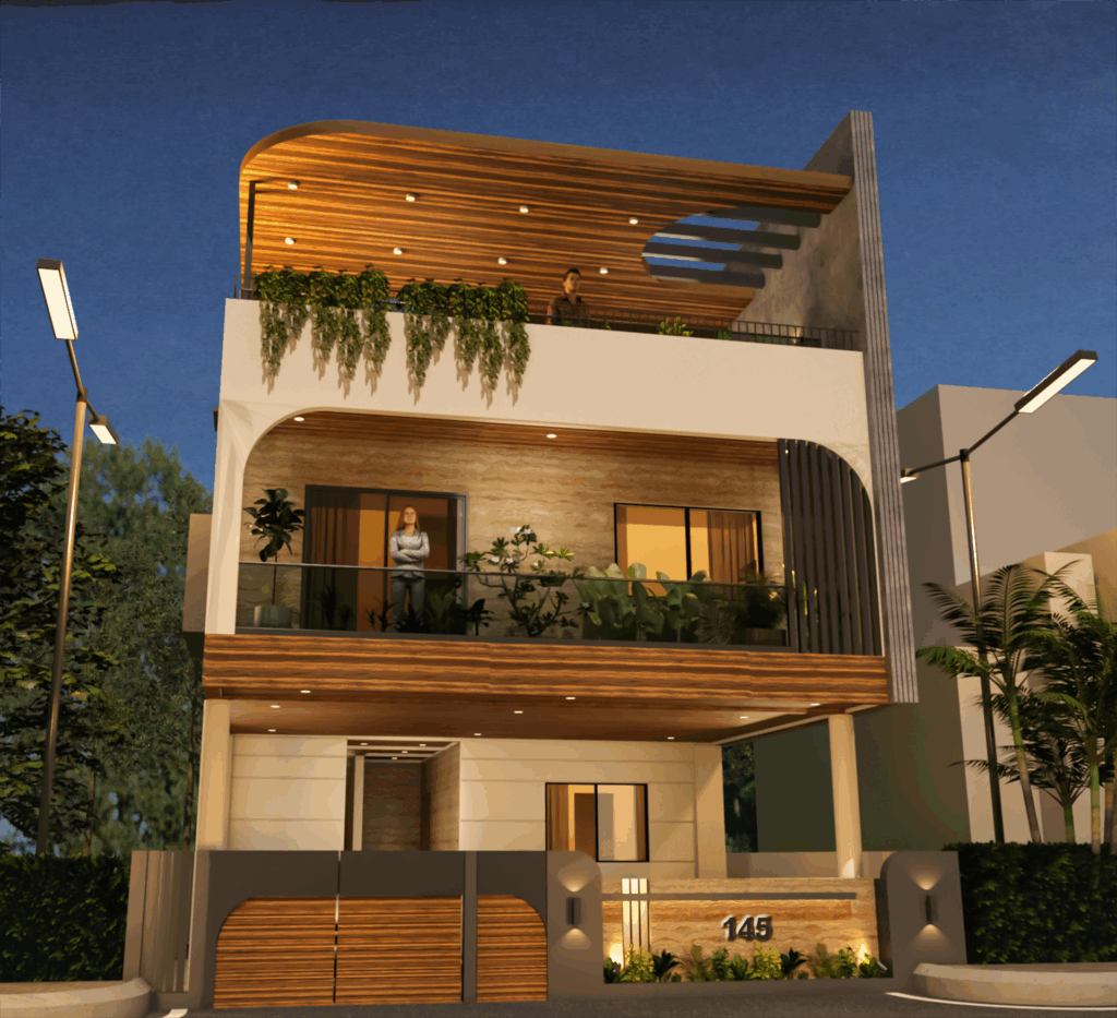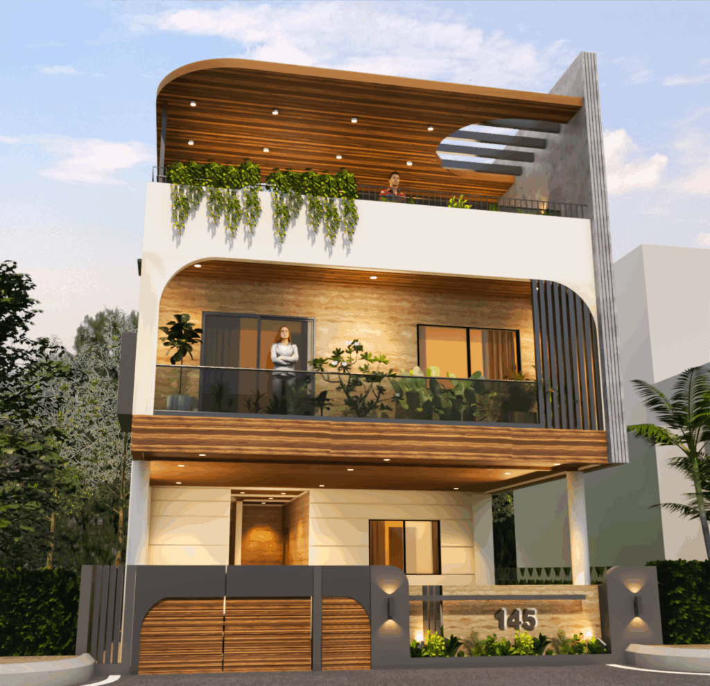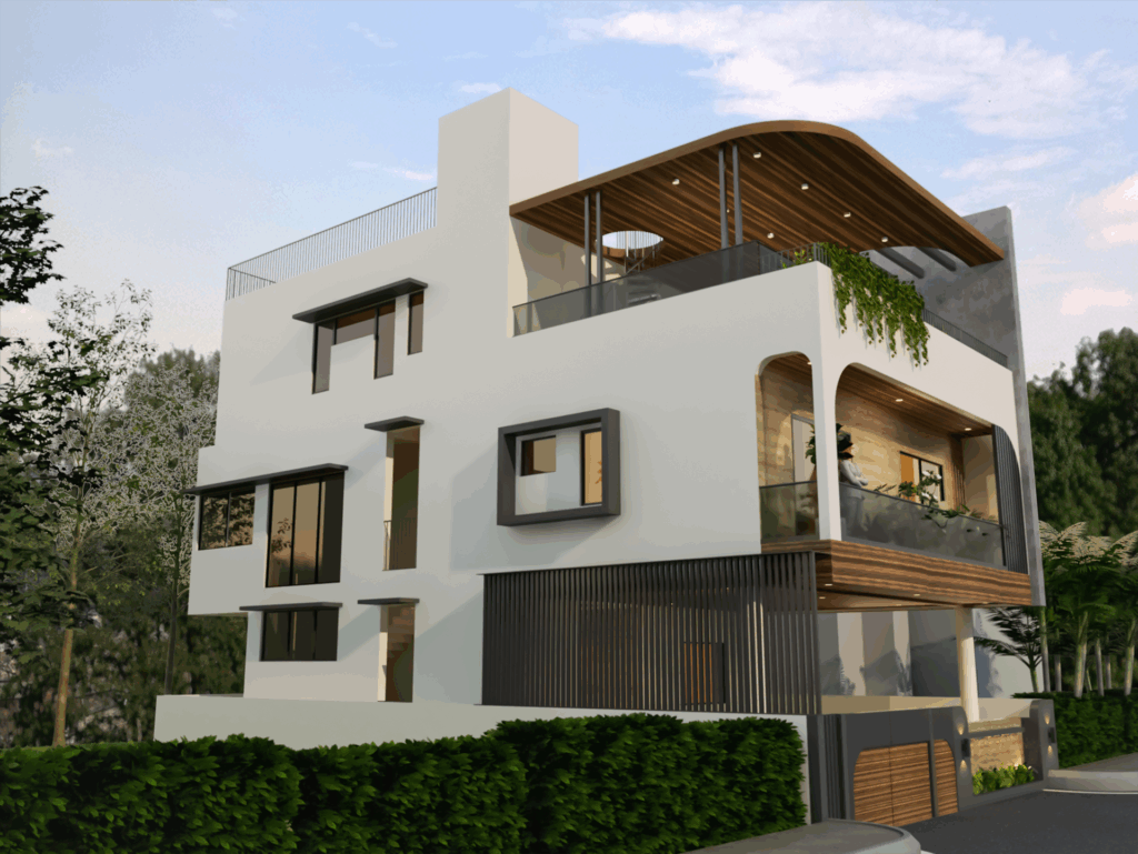 Exterior Aesthetic: Defined by curvilinear forms and material stratification: white plaster, warm wooden slats/louvers (canopy), and a central wall clad in Travertine tile.